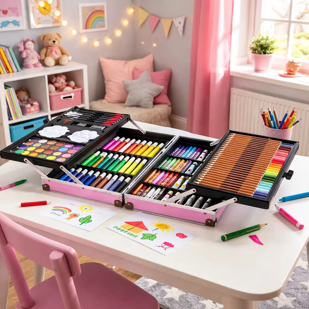 Vše, co malý umělec potřebuje, na jednom místě. Malířská sada Maaleo se 144 díly potěší každé dítě, které rádo kreslí, maluje nebo si hraje s barvami. Přehledně uspořádaný kufřík ukrývá bohatou sbírku pastelek, fixů, akrylových a akvarelových barev, štětců i dalších pomůcek. Stačí otevřít a můžete tvořit.