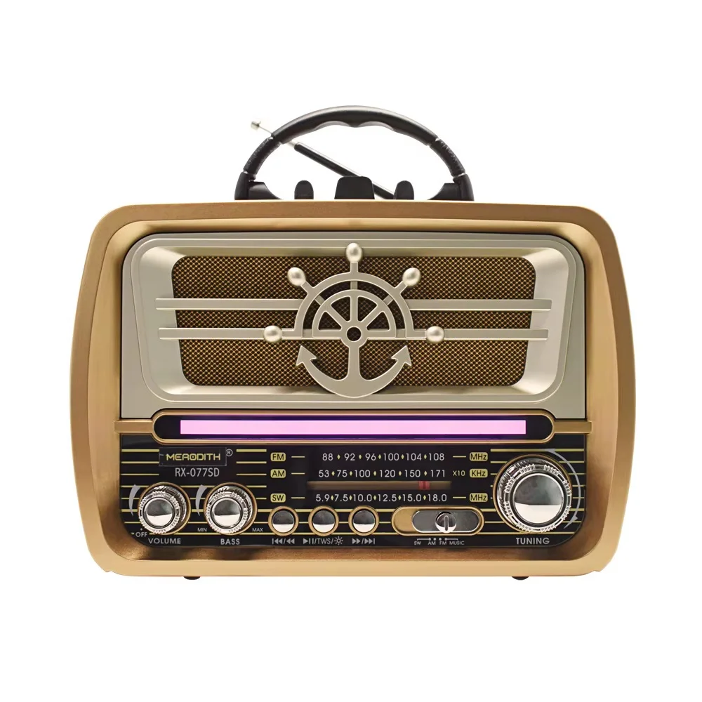 Přenosné Bluetooth rádio značky GOLON v retro provedení spojuje klasický vzhled s moderními funkcemi. Podporuje příjem v pásmech AM, FM, SW, nabízí Bluetooth přehrávání, USB vstup i barevné LED podsvícení a vestavěnou nabíjecí baterii.