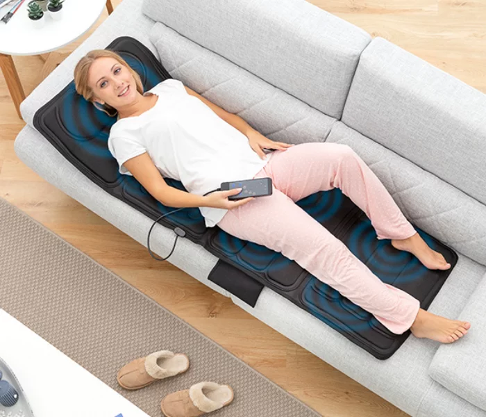 Pohodlná elektrická podložka Kalmat od značky InnovaGoods z jemné prošívané tkaniny, se kterou si užijete zaslouženou masáž celého těla díky 10 vibračním motůrkům. Parádní a uvolňující relax si s ní můžete užít jak vsedě v křesle, tak vleže na posteli či na zemi. Potěší vás i zahřívací funkcí či kapsou, do které si pohodlně uložíte ovladač.